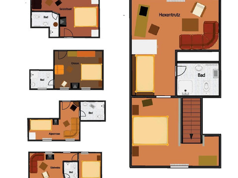 - 7 rooms with a total of 14 beds, each room with a shower/WC, TV, mini fridge, couch which can be converted to a bed for children,