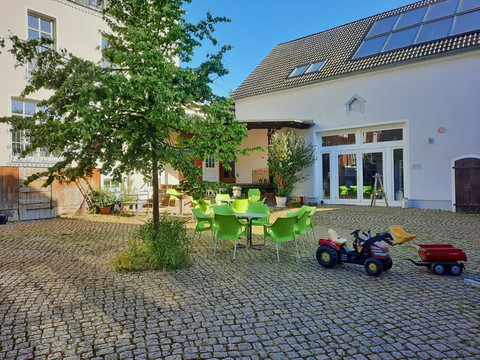 Erlebnishof Pleißental is a lively traditional four-sided courtyard. In addition to accommodations, the property also features event venues and a dedicated business area. Please note that events frequently take place on weekends.