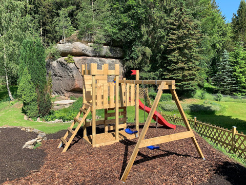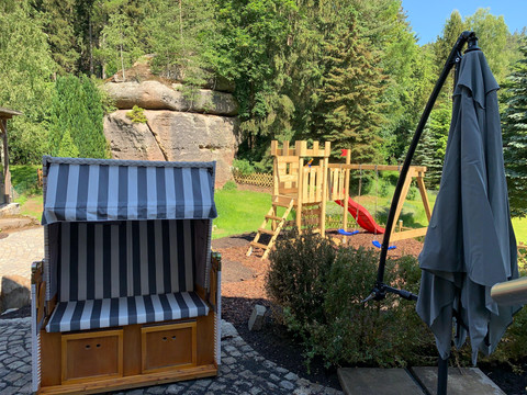 Holiday home Dunja is a traditional Upper Lusatian Umgebinde house. It is located in the spa town of Oybin - the pearl of the Zittau Mountains. Picturesquely and extremely quietly situated in the Oybiner "Hölle", a small access road. The beautiful garden property directly borders a climbing rock, which is located on our property. We have forest access, where you can reach the "Talringweg" directly. The Goldbach river flows through our property.