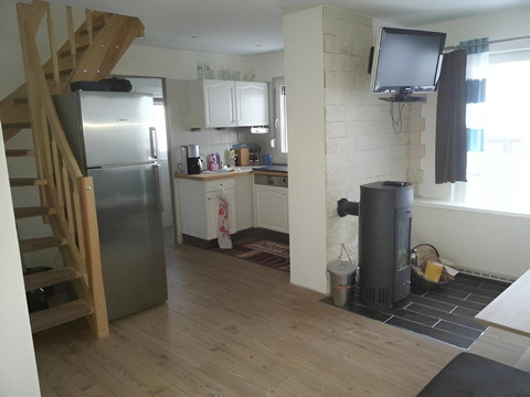 The living room and the dining area are a large open space. The cozy dining area has enough space for 5 people. In the living room itself, you can enjoy the benefits of an open fireplace for atmospheric evenings. Good entertainment is provided by satellite TV, DVD, and CD radio.