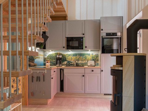 A modern house awaits you with a high pitch open ceiling and a pleasant room climate. The bedroom is equipped with a double bed. The kitchen is open to the dining area and has all the necessary utensils of a modern kitchen. The second sleeping/living area is located on the upper floor. There are two cozy sofa beds. The entire house has underfloor heating. On a spacious terrace with a grill, you can relax and enjoy your meals. Loungers are also available. A separate utility room offers a washing machine and a freezer.