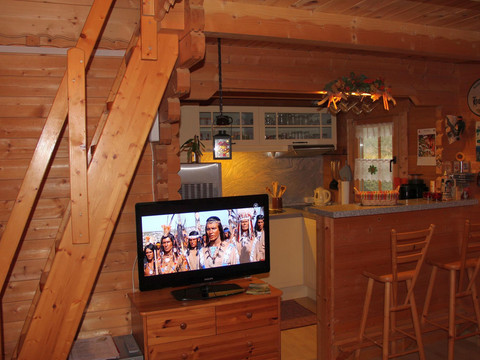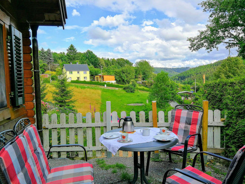 Holiday home - Laura is a new and comfortable log cabin that offers everything vacationers need to feel at ease. Among its advantages are not only the comfortable furnishings of the holiday home but also the offer of relaxation options (quiet location on the edge of the village and forest) as well as activities around your holiday domicile, and the beautiful and conveniently located area. Our log cabin "Laura" is located 25 km south of Chemnitz, in the beautiful Zschopau Valley in Schlößchen, a district of 09439 Amtsberg. The log cabin is situated on our property, surrounded by a dense hedge and fence on three sides. There is a private parking space available on the property for cars. Wi-Fi is available in the holiday home and relaxation areas. The terrace for your stay in the fresh air, even in rainy weather or to escape too much sun, is furnished with a beautiful cozy seating area and covered with a "pagoda pavilion" (4 x 4 m).