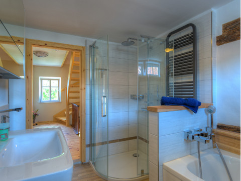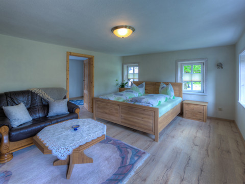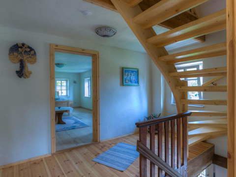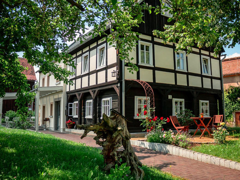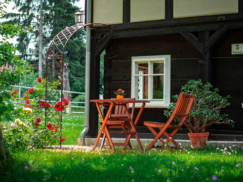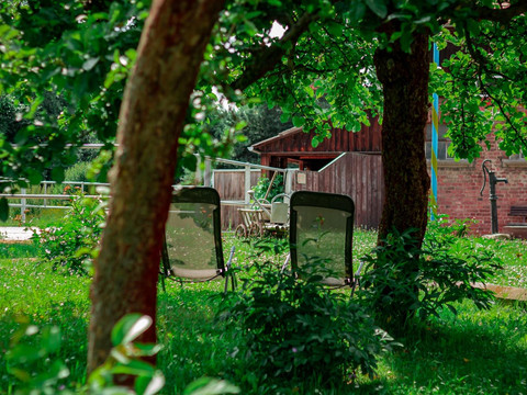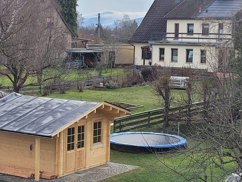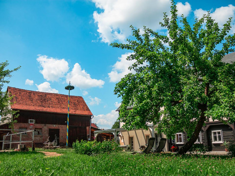 Our lovingly renovated vacation home is situated in a quiet location, far from noisy streets, surrounded by 3,000 m² of meadow area, which has been partially (about 1,000 m²) designed as a feel-good farm for you. In the garden directly next to the cottage are two seating areas in the greenery, here you can enjoy nature in peace. For children, a spacious lawn with a trampoline and swing offers many opportunities to play.