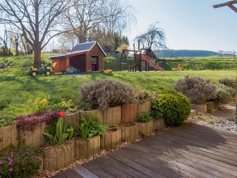 Our three idyllic holiday apartments, located on the outskirts of a former farm, each have a terrace where one can relax surrounded by greenery. A sauna also invites you to unwind. On the private playground, children can enjoy fresh air and play.