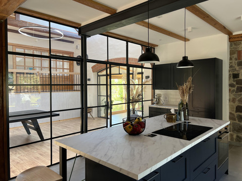 From the barn hall, you can access the kitchen, the living room, and via stairs to 4 bedrooms, as well as a bathroom and guest toilet.