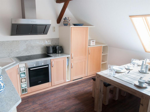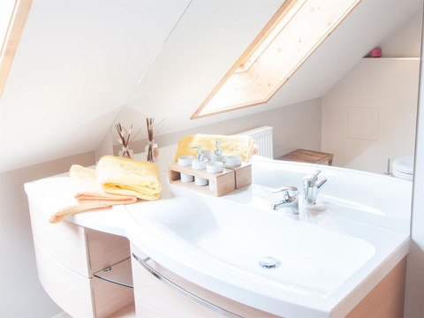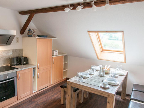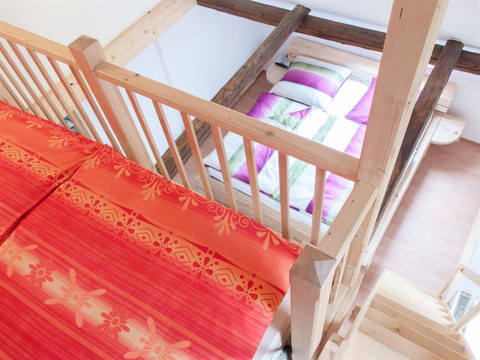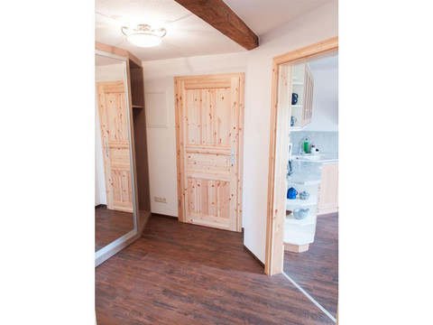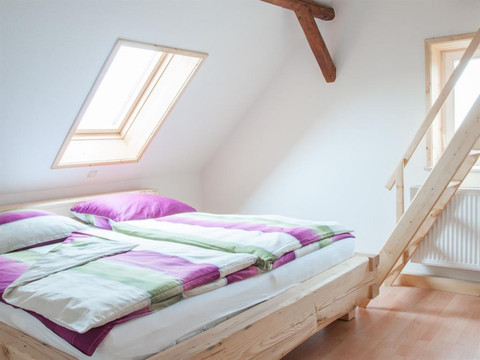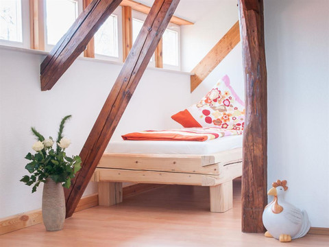 The holiday apartment is located in Bertsdorf, about 5 km from the town of Zittau. The holiday apartment is on the 2nd floor of a renovated "Umgebindehaus" and is lovingly and stylishly furnished. It has a fitted kitchen with modern appliances and a cozy dining area. The chic bathroom is equipped with a shower/WC and a large washbasin. In the living room, you can relax while watching television, enjoying DVDs, and unwinding. Please note that the parents' bedroom and the children's bedroom are only separated by a staircase (gallery). Another bed is located in a niche in the living room. The beds and mattresses are new and comfortable.