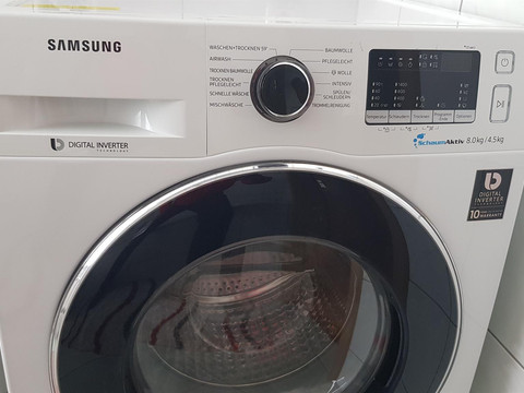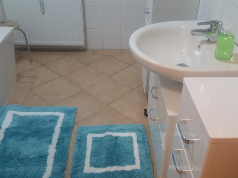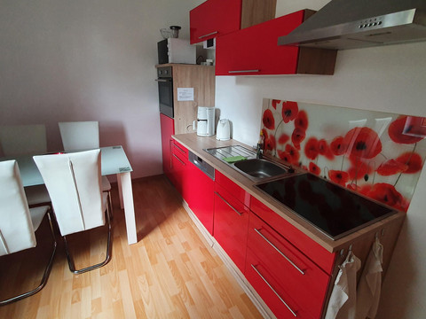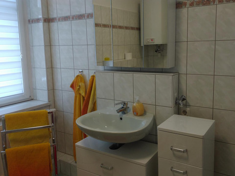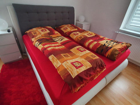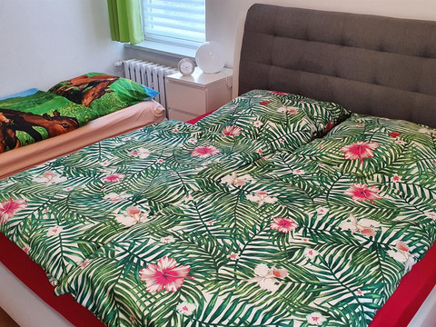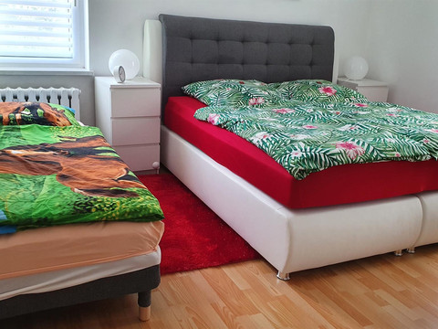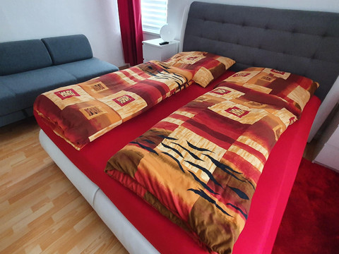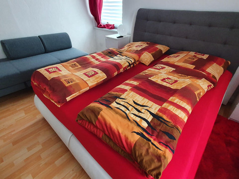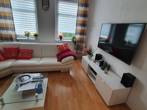 Our holiday apartment Anna accommodates up to 4 people (1 double bed and one single bed (sofa bed) in the bedroom and an extra bed in the living room or a cot in the bedroom). In the FeWo Anna, a pet is welcome and costs a one-time fee of 20 euros. The living room is equipped with a 55-inch TV and a sectional sofa. There is also a TV in the bedroom, and the bathroom features a washer-dryer.