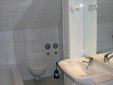 Spacious, enclosed entrance area with wardrobe; bathroom nicely tiled, bathtub, shower, towel dryer, WC, underfloor heating.