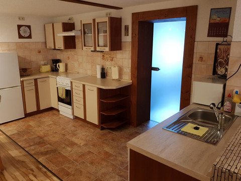 -kitchen with 4-plate stove, oven, microwave, coffee maker, kettle, toaster, refrigerator with freezer compartment, and dishwasher