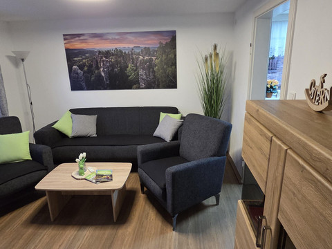 The living room invites you to stay with a sofa, two armchairs, and a TV for relaxing or cozy game nights. In our play area for the little ones and board games for the larger ones, everyone will find a nice activity.