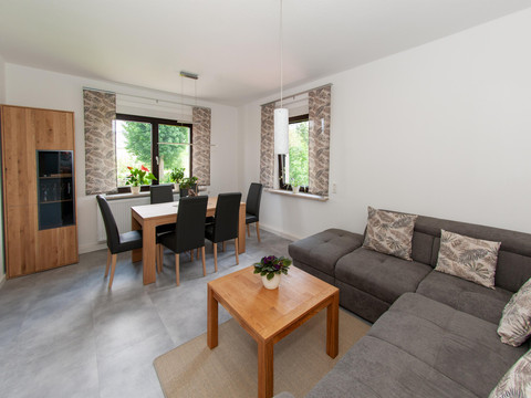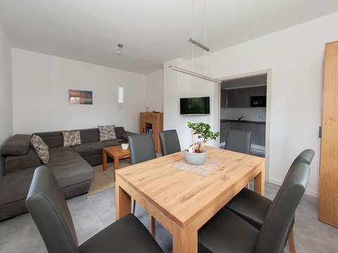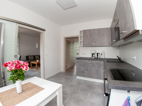 It offers space for a maximum of 5 people with 2 bedrooms, a kitchen, and a living area. The apartment is on the first floor and is barrier-free. With a stairlift, it is accessible to older and/or mobility-impaired individuals. There is a private parking space directly at the house, as well as a terrace with seating and barbecue facilities available.