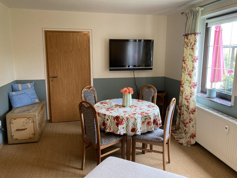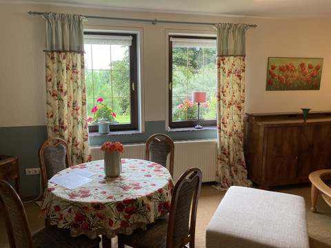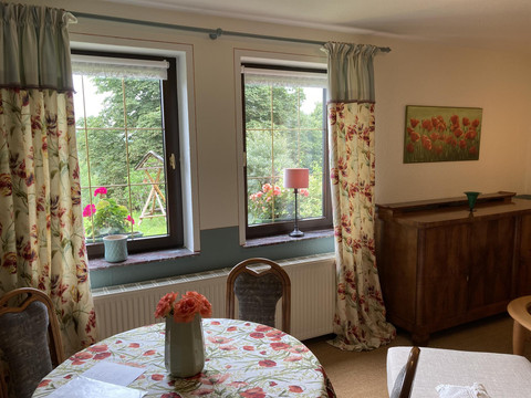 The vacation apartment is located in a two-family house on the outskirts of Greiz, the pearl of the Vogtland. Due to its elevated position, it offers a fantastic view over the hilly landscape of the surroundings with extensive meadows and forests. The location is an ideal starting point for hikes, bike tours, and walks, as well as for exploring the nearby attractions of the region. Whether culture, history, architecture, sports, or wellness