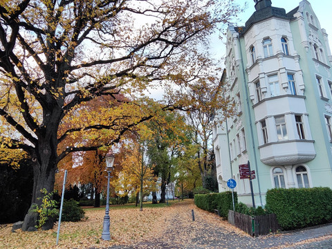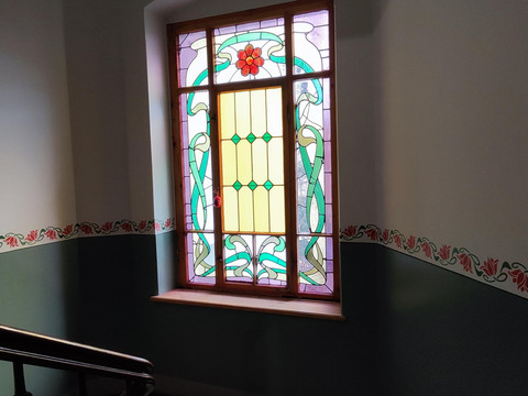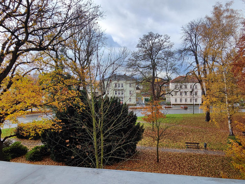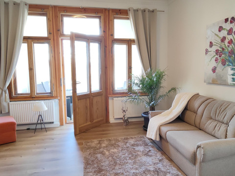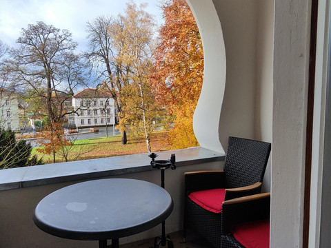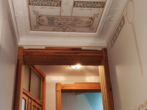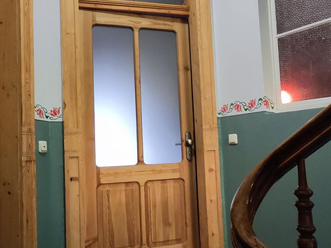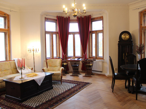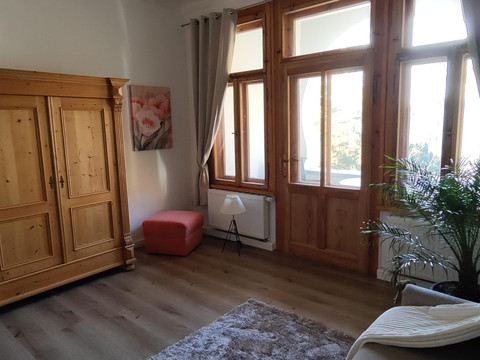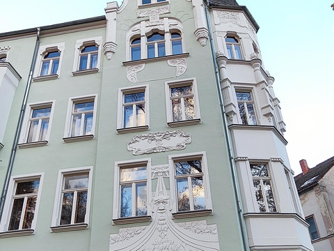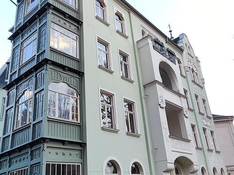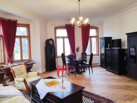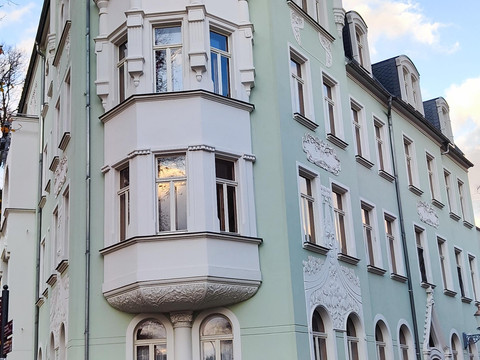 The apartment itself is located in the most beautiful listed Art Nouveau building in the Zittau city center, on the 2nd floor, overlooking the park of the former city fortifications.