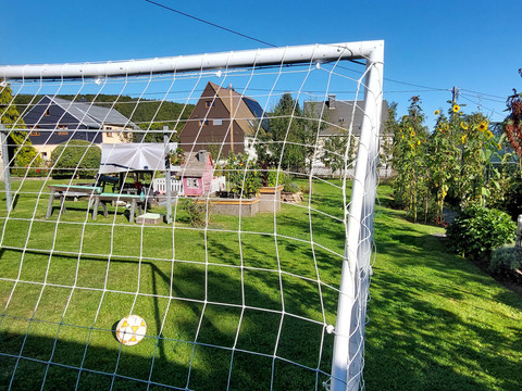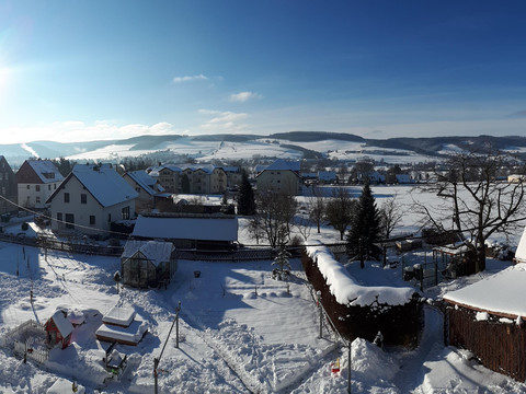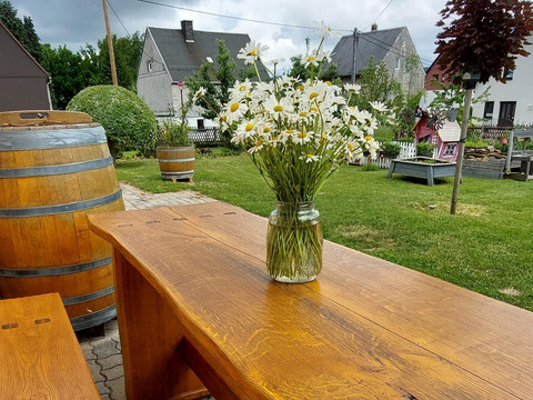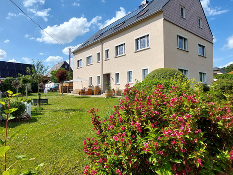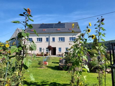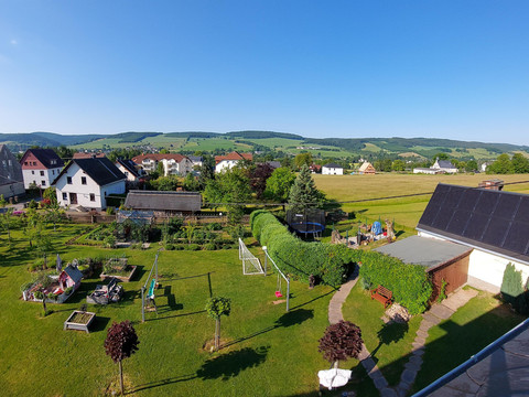 Welcome to our spacious and comfortable holiday apartment. It is the perfect retreat for your relaxing vacation. You will enjoy a splendid view of the surrounding landscape and nature. From this ideal starting point, explore the beauty of the Ore Mountains. For your sustainable stay with us, we place special emphasis on environmentally friendly energy sources and climate-neutral measures. Our holiday apartment is supplied with clean electricity from its own photovoltaic system. Additionally, we use solar thermal energy for environmentally friendly heat generation. The large garden in front of the house invites relaxation and features a seating area with a barbecue facility. For our little guests, there are plenty of play opportunities as well as ample space on the green lawn. In the garden, seasonal fruits, vegetables, and kitchen herbs grow.