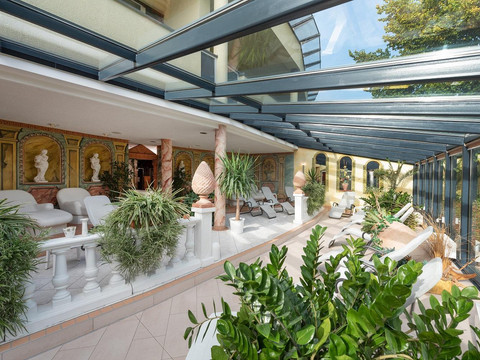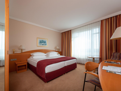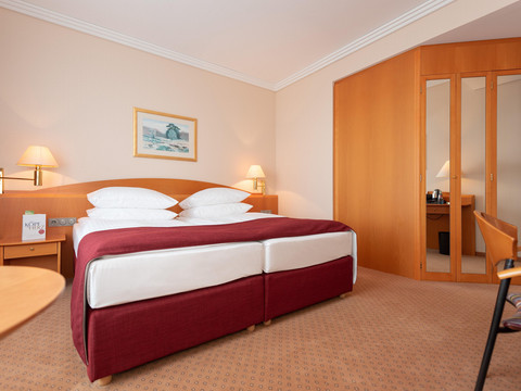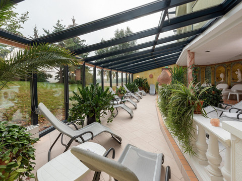Near Chemnitz and Zwickau, just a short drive south of Leipzig, lies the small town of Meerane. Its convenient location – on the one hand to the industrial cities of the region, and on the other hand at the edge of the Saxon castle country, close to well-known excursion destinations in Thuringia and the Ore Mountains – makes this conference and leisure hotel with its 135 rooms and suites particularly attractive. Another highlight of our establishment is the THERMARIVM: Built in the style of Roman baths, you can enjoy the soothing effects of differently tempered steam baths and saunas, bathe in private whirlpools, or relax on heated rest benches. A rock shower, the modern plunge pool, and shower cascades create a refreshing experience after your sauna session.