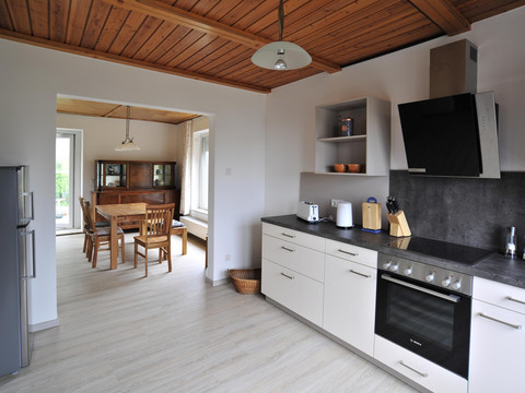 A large sofa bed in the living area, large modern kitchen,