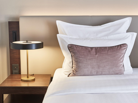 The understated interior of our rooms sets a stylish contrast to the baroque opulence of the surroundings. The 185 generously sized rooms and inviting suites are equipped with all modern amenities, and the extremely comfortable bed, with a length of 2.10 m, invites not only for restful sleep but also for a cozy breakfast.