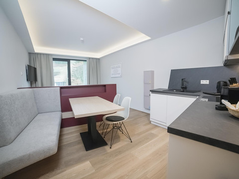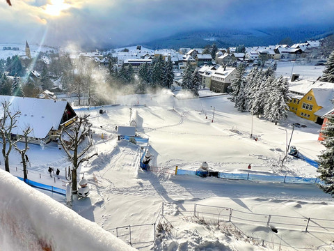We offer serviced apartments in the best location of Oberwiesenthal, directly at Fichtelberg. Vacation without a car. Park your car conveniently on the resort grounds and reach all attractions and leisure activities on foot. Each apartment features a fully equipped kitchen with refrigerator and freezer, stove, microwave, and dishwasher. You will find a pickup store in the resort where you can self-cater and purchase everyday necessities. On the ground floor, there is a bar adjacent to the wellness area where we offer bread, rolls, and coffee, as well as a snack menu. Take advantage of the ideal location of our resort to explore the wonderful surroundings or to be actively sportive. We look forward to your visit.