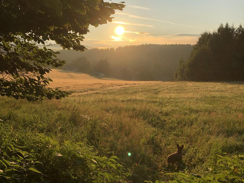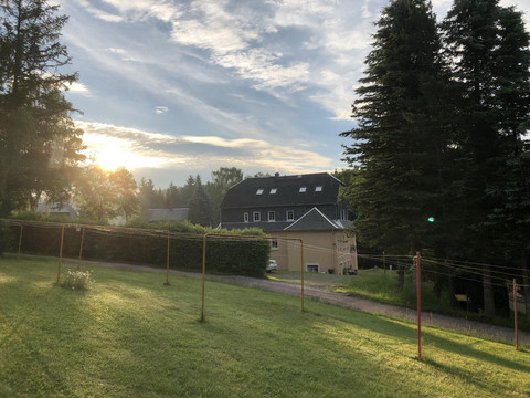 The villa was built in 1925 and stands freely on a 3,000 sqm plot in the middle of nature. The view from all windows is wonderful and the two stained glass windows in the entrance area as well as the lovingly and elaborately restored entrance doors show the special charm of the house. Directly from the house it goes into nature. Forest, water and hiking trails can be reached with a few steps. The Rauschenbach Dam, for example, is only 1.5 km away.