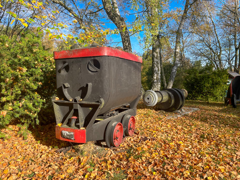The outdoor area contains machine parts from the former Zeißholz briquette factory as well as agricultural and household equipment.