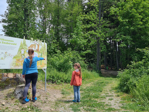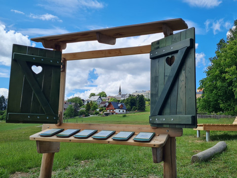 Accompanying the path is the discovery book available at the Tourist Info, which guides the children, supports them in solving the tasks, and of course is also a nice keepsake. Additionally, there is a lovely enamel mug and a lunchbox with the sweet motif of the Moosmannlein and his friend Ecki the squirrel. Those who have found all the letters at the end of the path are allowed to collect a small gift at the Tourist Info.