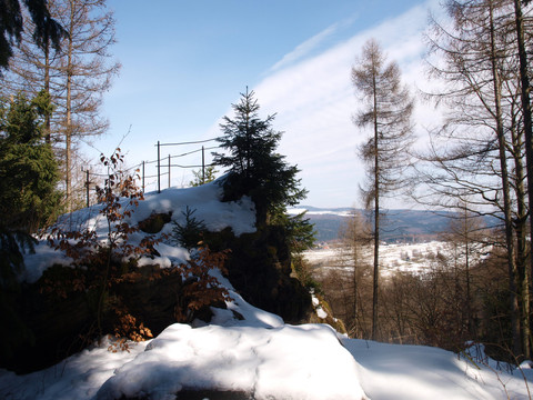 From the Saigerhütte area (part of UNESCO World Heritage) leads the EB (red) long-distance trail through the industrial area to the Heidenweg. At the gas station, we keep right, continuing on the EB (red). At the next intersection, the long-distance trail turns left onto the Königsweg. We follow the Königsweg uphill and later through the beech forest to the Schaaldenkmal. The EB (red) is left behind and at the monument, we turn sharply left towards the Bruchberg. A short steep ascent follows. We come to a junction with signposts. There, we turn right towards the Bruchberg. Before the path descends, it is a few meters to the Bruchberg (668 m). We then go back a bit to the named junction. The path to the left rises slightly and is partly wet. Continuing straight, we leave a transmission mast on the right. We go straight through the clearing and cross the Red Deer Trail. The path continues straight ahead, then we keep slightly downhill to the left. The Sophienstein (703.5 m, viewpoint) is about 50 m to the right of the path. After the view towards Brandov, we return the same way and head towards the Stößerfelsen. This path is partly damp; we turn onto the Erikaweg. Shortly after, we reach the RIDGEway (blue). Turning left, we make a short detour to the Stößerfelsen (683 m, rest and viewpoint). Then we descend on the Stößerfelsenweg/ RIDGEway (blue) towards Pföbe. We come to the Sedanweg, which we follow to Pföbe. We cross the S 216. The path continues to the starting point at the Saigerhütte area. We have reached our destination.