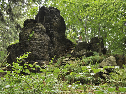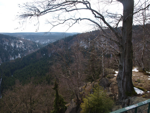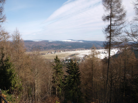 From the Saigerhüttengelände the KAMMweg (blue) leads towards Pföbe. We cross the S 216. At the fork Pföbe the trail leads over the Sedanweg, the Stößerfelsenweg uphill towards Stößerfelsen (683 m, rest and viewpoint). Just before the Stößerfelsen, turn right towards Sophienstein onto the Erikaweg. The KAMMweg is left. At the second junction we turn towards Sophienstein. The partially damp path leads to the Sophienstein (703.5 m, viewpoint), which is about 50 m right from the path. After the view towards Brandov, we walk a short stretch back and turn right onto a clearing. We go straight ahead and cross the Roter Hirschweg. Continuing straight ahead, we leave a transmission mast to the left. Towards Bruchberg it goes slightly downhill. The path is partially wet. We reach a junction with a signpost. There we turn right towards Bruchberg. Before the path becomes steep, it is a few meters to the Bruchberg (668 m). We walk a little back and follow the path steeply downhill to the left to Königsweg and the Schaaldenkmal. We have reached the Dörfelbachtal, which we follow downhill past the Dörfelteich. We meet the Heidenweg, which we follow towards Saigerhütte. Before the industrial area, the EB (red) joins. We follow this back to the Saigerhüttengelände.