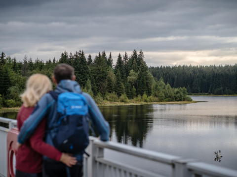 From the Sauschwemme hiking parking lot, follow the white-green-white markings in the direction of Auersberg. Continue on the ridge trail from Auersberg via Wildenthal to Carlsfeld. At the Talsperrensteaße continue on the white-blue-white E3 across the dam to Weitersglashütte. Continue on the white-red-white marked Hirschleckenweg via Jordanweg to the middle wing. Via the middle wing back to the starting point.