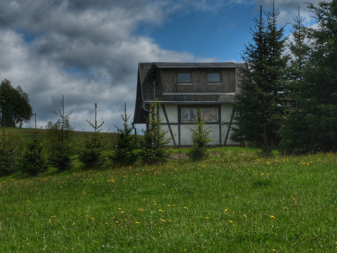 From the Windmühlenhof Dittmannsdorf, the path leads uphill towards Heidersdorf. On this path, you reach a viewpoint with a distant view of Schwartenberg (789m). Shortly before Oberheidersdorf, we turn right towards the wind park. We follow the yellow marking towards Waldhaus (Relhök) through the wind park. Then we reach the Kreuzung Hand. Turning right, we leave the yellow marking and follow the red to the Clemensstein (forester of the Schönbergs). The path towards Pfaffroda and Schönfeld is marked green. Next, we reach Schönfeld, the road leads downhill towards the castle. The B 171 is crossed; past the farm pond we turn left into the castle park. Past the crypt of the Schönbergs and the castle pond, we reach Pfaffroda castle with church (Silbermann organ). Further along the Hofgrund towards Dittmannsdorf, the path leads past the glass refinement Dietel to the dam of the Dittmannsdorfer pond.