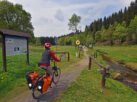 The Freiberger Mulde meanders wildly and romantically from Moldava in the Czech Republic through the Erzgebirge mountains to Sermuth in the Leipzig lowlands. However, the spring of the Freiberg Mulde is not far away in the Czech Moldava in the Bohemian Ore Mountains. You should not miss a trip to the spring. You can enjoy the breeze on the route downhill between green fir forests and past wide meadows. At Rechenberg-Bienenmühl, there are a few small climbs to overcome before the ride continues towards Freiberg. After another 50 kilometers of exciting discoveries, you reach Döbeln. Afterward, the cycle path leads along the river bank through a varied landscape past majestic castles and palaces. Due to its hilly relief, the Mulde cycling path along the Freiberger Mulde is suitable for cyclists with a high fitness level.