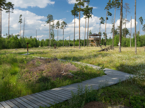 This circular route through the Pöllwitz forest was created in the shape of an eight with two almost equally sized loops. The intersection runs about 500 m past the fortified church in Pöllwitz through the village.