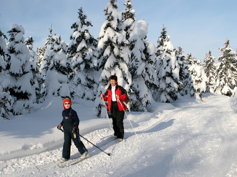 The central trail entry point of the popular Neuhausen Schwartenberg cross-country ski trail is at the Bad Einsiedel inn near the Schwartenberg. Here, five different route lengths from 2 to 12 km offer cross-country skiing enjoyment for the whole family. The relatively snow-secure circular trails at an altitude of 600-800m mostly run through forest areas and are thus well protected from drifting snow. The different circular trails are color-coded and easy to recognize. Almost all trails offer one track for classic skiers and one for skating enthusiasts. At the “Göhrener Tor” as well as at Eberhardtweg, you can conveniently connect to the Czech trail network towards Mnisek and Kliny. The ski main trail is also of interest to long-distance skiers among the cross-country skiers. Also at Eberhardtweg is the connection to the Seiffen local trail and to the trail of the Sportwelt Preußler.