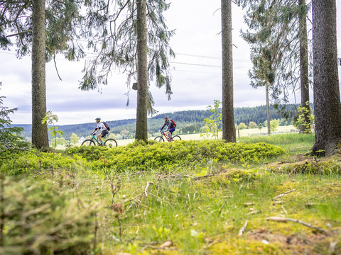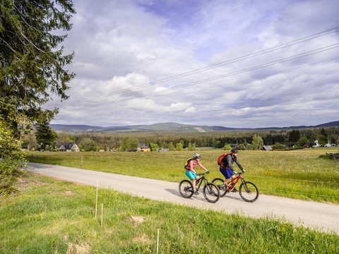 Passing the “Mittelflügel”, the “Wellenschaukel” and the guest house “Sauschwemme” the route leads through the nature reserve “Kleiner Kranichsee”, one of the major raised bogs in the Ore Mountains. Take the old bobsleigh run heading towards Johanngeorgenstadt and cross the border to get to Potůčky (695 m). Continue following the forest road with a slight ascent, along the Schwarzwasser (black water). After taking a turn to the right in Luhy (former settlement) keep riding uphill to the Blatenský vrch (granit massif, 1,043 m, old lookout tower, “Wolfspinge”)