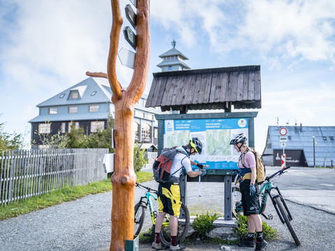 Immediately after the stamping point at the Klinovec mountain hotel, the trail fun begins. Almost 4 kilometers of the Rubin Trail can be used before heading back up towards Bozi Dar via a connecting trail. If you're not quite sure about trails, you can use the Azur Trail, where the Stoneman is also signposted. On the white-red-white marked upper "Neklid Trail", the route passes the X-Cross route and leads to Bozí Dar (Gottesgab). The village is one of the most important winter sports centers in the Czech Republic and home to Lukás Bauer, the country's most successful cross-country skier and Stoneman Miriquidi messenger. The ascent to the Fichtelberg begins here: over the border into Germany, past the "Relaxhotel Sachsenbaude" and on along the Wellenschauckel to the highest peak in the new federal states at 1,215 m ("Hotel Fichtelberghaus" with viewing tower, mountain station of the oldest cable car in Germany, built in 1924). The Fichtelberg consists of crystalline rock.