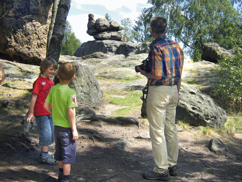 Hello, I am Freda (the brave and strong one), Lapius (grandpa Lapius - lapis in Latin means stone), the small wandering stone ... and I will accompany you on the adventure hikes to The Mouse Trap (Mausefalle), The Elephant Rocks (Elefantensteine) and The Fox’s Pulpit (Fuchskanzel). There is a lot to discover in the Zittau Mountains. The shape of some sandstone rocks is reminiscent of a pigeon, a rhino, a lion and even a hen sitting on eggs. Such curious creations can be marvelled at in the Jonsdorf millstone quarries, among others. There are also rock formations called The Organ (Orgel), The Teapot (Teekanne) or The Three Brothers (Drei Brüder). Between the spa town of Oybin and Mount Töpfer, part of the path through the Stone Zoo (Steinzoo) is even suitable for a visit with prams. Around The Fox’s Pulpit in the air spa of Jonsdorf, looking for the animals can be combined with a detour to the Karlsfried Castle ruins. How were the rock formations actually created and who is Freda? You will find this information in my story starting from page 10 onwards. The first part will help your parents with planning and orientation. You can also find all the routes online for download at www.steinzoo.de.